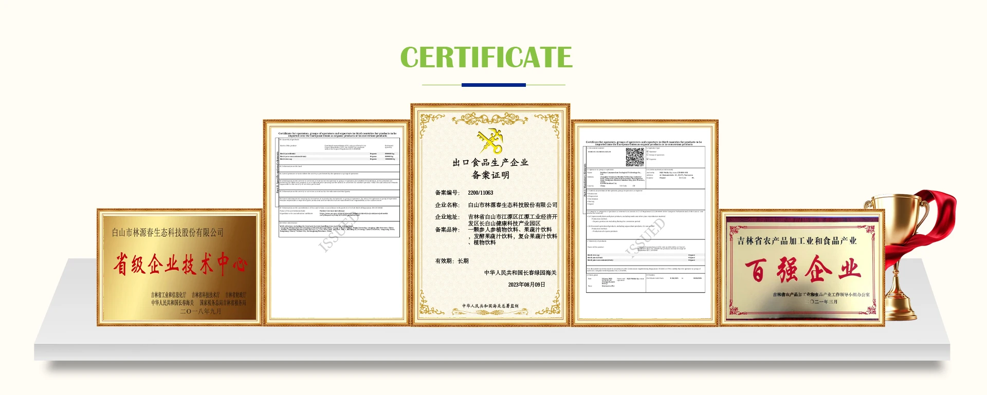 Baishan Linyuanchun Ecological Technology Co., Ltd. was founded on January 18, 2007, and is located in the Changbai Mountain Health Technology Industrial Park, Jiangyuan Industrial Economic Development Zone, Baishan City, Jilin Province. (Its predecessor, Jilin Jinwang Wine Co., Ltd., was founded in Shajin Village, Wangou Town. It was renamed Baishan Linyuanchun Ecological Technology Co., Ltd. in 2009 and was fully restructured into Baishan Linyuanchun Ecological Technology Co., Ltd. in 2017.) It is a modern private enterprise integrating improved variety breeding, planting, processing, trade, sales, chain operations, military auxiliary food supply and distribution, and related technical services and research and development. The company has a registered capital of 37.19777 million yuan, covering an area of 106,789 square meters and a construction area of 48,999 square meters. It has 1,800 mu of its own planting bases and 9,500 mu of regional chain planting area. The enterprise has 168 employees and 30 professional and technical personnel, including 1 national wine taster and 4 senior special bartenders. The company has passed HACCP certification, organic certification, ISO9001:2008 quality management system, SO14001:2004 environmental management system certification, and ISO22000:2018 food safety management system certification. It has won 34 national patents, obtained 69 trademarks, 13 software copyrights, and 2 scientific and technological achievements. The company has successively been recognized as a national key leading enterprise in agricultural industrialization, a national high-tech enterprise, a national planting demonstration zone, a national "contract-abiding and credit-worthy enterprise", a national "Star Innovation Space", and a national intellectual property advantage enterprise. It has also won titles such as the Sixth National Civilized Unit, "Jilin Time-honored Brand" enterprise, Jilin Provincial "Specialized, Refined, Characteristic and Novel" enterprise, and advanced grass-roots party branch. The "Linyuanchun" trademark has been awarded the "China Well-known Trademark". Adhering to the development concept that science and technology are the primary productive forces, with science and technology as the core and quality as life, the company adheres to the product positioning of "original ecology, healthy products". It cooperates with Jilin University and other scientific research institutions to continuously innovate and improve production processes and product formulas. Through the transformation of scientific and technological research and development achievements, it adopts traditional craftsmanship combined with modern processing technology to maximize the retention of the natural nutrients and taste of raw materials. At present, the company has developed 6 series of 158 products, including health products series, wine series, beverage series, mountain treasures, specialties, and daily chemicals, which are sold well at home and abroad. Looking forward to the future, under the leadership of party building work, the company will seize opportunities, take the initiative, accurately grasp the main theme of development, and aim to "shape a model of global healthy food and lead a new fashion of high-quality life in the future". It will deeply cultivate the health industry, with scientific and technological innovation as the wing and green development as the rudder, increase investment in technological research and development and scientific and technological innovation, adjust the industrial structure, expand marketing models, explore domestic and foreign markets, implement brand strategy and talent strategy, develop both capital and industry, combine financing with intelligence introduction, and continuously enhance the core competitiveness of the enterprise and gather positive energy. It will present more natural gifts from Changbai Mountain to global consumers, build a healthy, harmonious and sustainable beautiful life picture together, strive to create the first brand of Changbai Mountain ecological food, and become a bright pearl in the field of health industry.